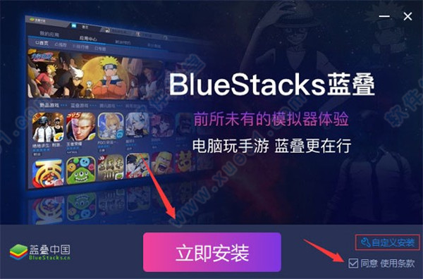2、然后双击bsgp_925Ggame_com.bbys.yueyou.bs.exe文件,即可进入软件安装界面。软件一般会默认安装在c盘,这里我们点击自定义安装就可以更改安装路径,点击安装:路径【E:Program Files (x86)BluestacksCN】