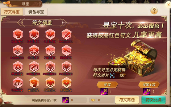 1、符文寻宝这个界面用元宝进行单次寻宝或者十连抽寻宝,每天都有一次免费的单次寻宝的机会,符文寻宝是获得高级符文的途径之一,每天都有一次免费的单次寻宝的机会。