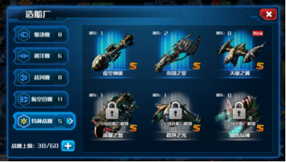2、战舰:制造和改造战舰用于进行各项战斗,各式战舰分五个大类共20多艘