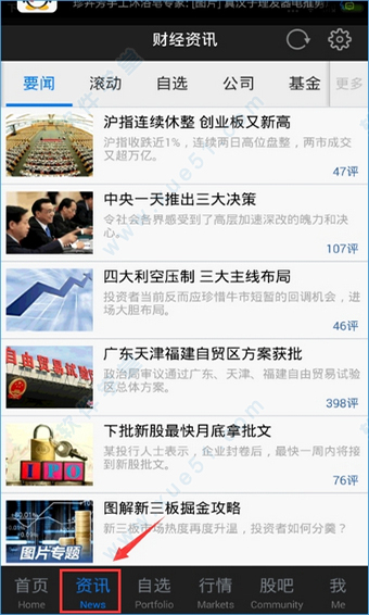 1、进入软件首页,即可看到财经资讯、自选股、大盘指数、个股排行、股吧、全球市场、板块排行等栏目,而且还能了解最新财经要闻。