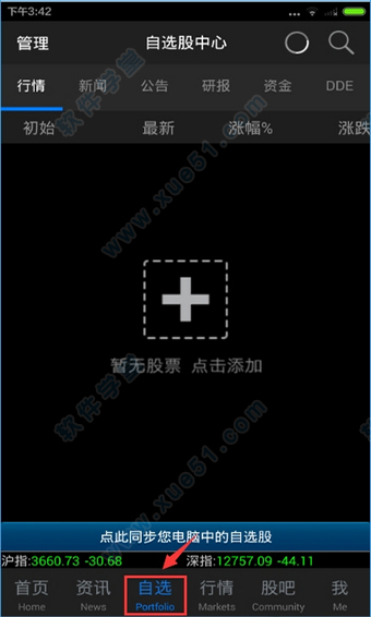 3、进入自选股界面,即可加入自选股了解最新的自选股股票行情,并且还能知道自选股的公告、研报、新闻等内容。