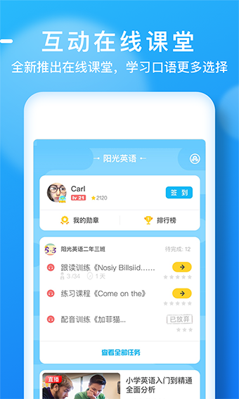 天天乐学APP中有大量丰富的英语口语学习课程,同步学校学习进度,课后练习定时推送,通过手机就能轻轻松松完成练习。