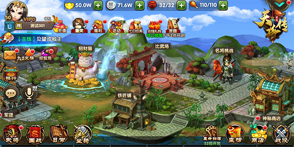 国战系列玩法是其最为精心设计的玩法,也是整个游戏核心玩法所在,国战系列玩法包括了实时国战、国家任务、官职争夺、个人军衔等等。实时国战,魏蜀吴三国玩家需要通过攻占边境、虎牢关、华容道和王城来夺得胜利;而国家任务则会在磅礴大气的皇城里面开展,高奖励与高风险并存;官职争夺和个人军衔则会让你获得至高无上的尊重。如此完整的国战系列玩法设计在手游产品中首屈一指,必将带你回到三国乱世时代,感受战火和硝烟带来的快感!
