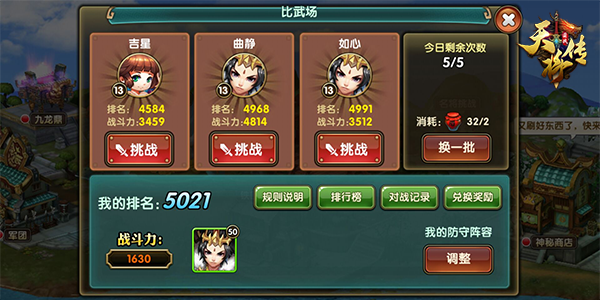 如下图显示,这里就是《天将传》的比武场了,是玩家们体现自己武将实力的地方!