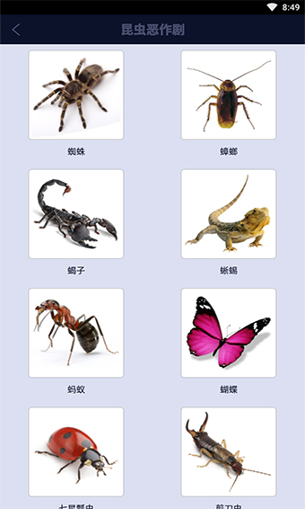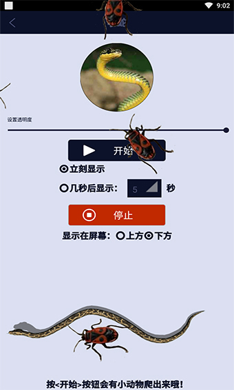 爬虫恶作剧:点击昆虫恶作剧,选择其中一种,设置好昆虫个数以及速度和分布范围。点击开始,屏幕中就会出现你所选昆虫。