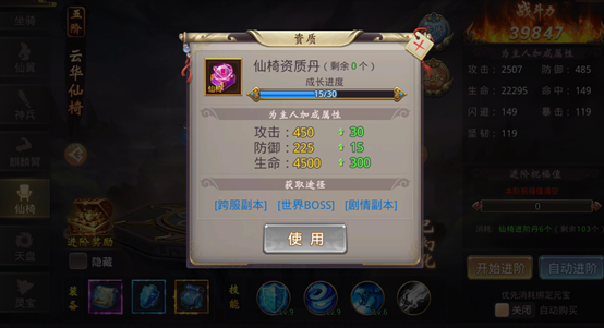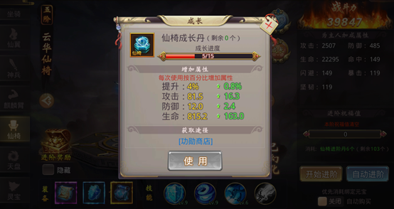消耗仙椅进阶丹可以对座椅进行进阶操作,仙椅进阶可以增加仙椅属性。消耗进阶丹且进阶失败后,会自动累积祝福值,祝福值越高,下一次进阶成功率越高。