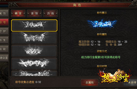 称号分为历练、首领、稀世三类。点击每个称号可了解获取方式以及对应的属性加成。