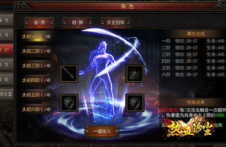 奋勇和鼓舞获取指定的领域装备放入吞噬后激活;天玄剑阵需获取镇魔珠和封魔石激活。激活后获得大量攻击、生命属性加成。