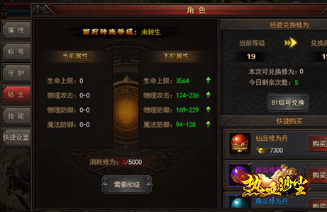 ①角色到达80级之后开启,通过击杀BOSS、参与活动、商城购买获得修为丹,使用后获得修为,可消耗修为提升转生等级。