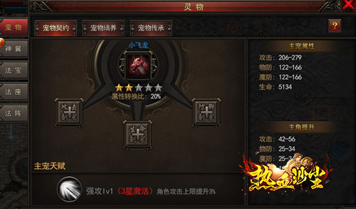 宠物通过猎宠、击杀BOSS掉落碎片宝箱等方式获得。宠物助战后可以大量战斗力,一共可助战一个主宠三个副宠。提升的战力由宠物星级、稀有度、等级来决定。