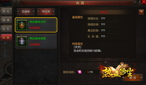 ②在属性页面点击神器可显示神器页面,在角色等级到达要求之后使用封魔石*10即可激活该神器,获得大量属性提升。