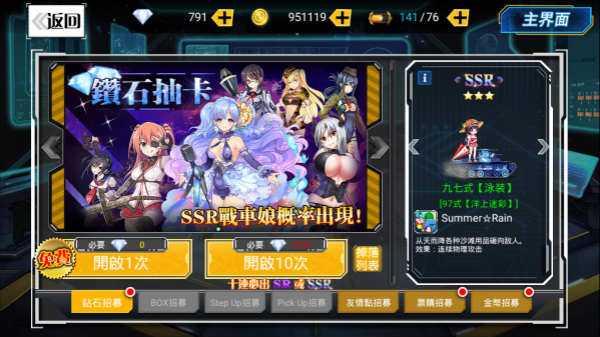 进入游戏后,会获得3个战车少女(诺亚、维斯利、喀秋莎),根据主线任务,当完成通关关卡1-2的主线任务,可以领取到编制(召唤)九七式的任务,将九七式召唤完成,完成到通关关卡1-4的主线任务后,就会领到编制拉乌莉的任务,此时我们就可以快速的凑齐5位战车少女。在前期没有抽到更好的品质的战车少女时,这5个战车少女相当好用,不管是通关关卡,还是竞技场战斗,在表现上都很不错,个人认为九七式虽然是SR品质,却有着SSR品质的表现,毕竟可以通过主动释放群体治疗,很好的挽救战局。