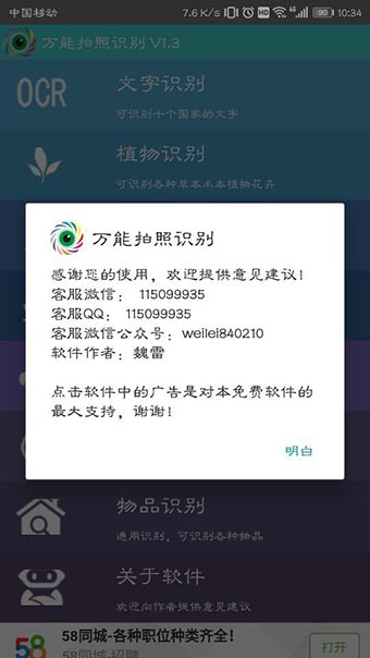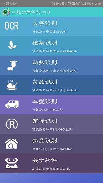 万能拍照识别这是一款非常实用的软件,它不仅可以在生活上的一些小事上帮助您,还可以让您学到很多东西,你在生活之中遇到了什么不懂的东西或者不懂语言文字都可以通过这个来识别一下,之后您将会立马得到答案。这款软件它的页面很简单,但是很实用,还可以识别种类有很多:文字识别(在文字识别里面有包含了多种国家的语言:中、英、葡萄牙、法、德、意大利、西班牙、俄、日、韩语等国家的语言识别)、植物识别、动物识别、菜品识别、车型识别、商标识别等等,其实使用这款软件很是简单,只需要和平常拍照一样就好了,拍照的像素很是清晰,感觉有超清吧!以后遇见朋友讨论什么车啊、商品啊、明牌啊等之类的你就再也不需要担心了,万能拍照识别会帮你识别一切,让您脸上罩得住,不会丢失您的面子和身份。还在想什么?来下载试一下吧!
