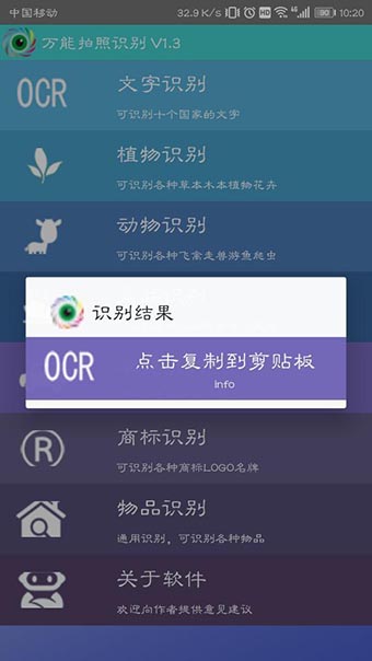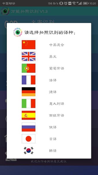 1、拍照识别十国文字(包括中、英、葡萄牙、法、德、意大利、西班牙、俄、日、韩语);