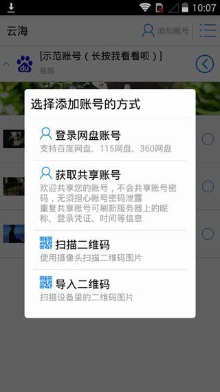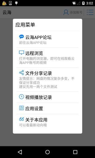 云海app最新版这是一款工具类型的app,这款软件它是不提供、也不可以存储,更不能不传播任何可视化和可下载的内容,它的功能是将百度网盘和115网盘以及360网盘的账号联通起来,让用户更加方便,简单的管理存储在这三个网盘里面的资料。这款软件的画面很是简单,使用起来也是很快的,用户只需要随便添加一个账号,就可以搜索里面资源,只要添加了账号那么里面的功能就和网盘差不多了,可以在线播放资源,可以随便移动资源(可以同时添加多个不同app的账号,例如网盘账号,360账号,然后可以在这里面移动资源,例如把360里面的资源移动到百度网盘里面去)。云海app之中还有二维码分享账号功能,这个功能仅作为满足用户分享账号而又担心被擅改密码的需求而制作,在二维码图片生成之后,本应用不收集,不保存,不传播二维码图片,完全由用户自行决定二维码图片的去向。