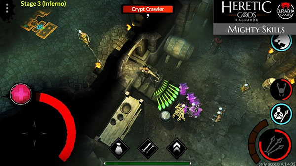 异端神的控制系统是直观的,并且很好地适应触觉设备。随着屏幕左侧的虚拟横梁你可以移动你的性格,而在右侧的按钮,你可以攻击和使用技能。只需按下按钮的攻击,你的英雄会自动瞄准最近的敌人。
