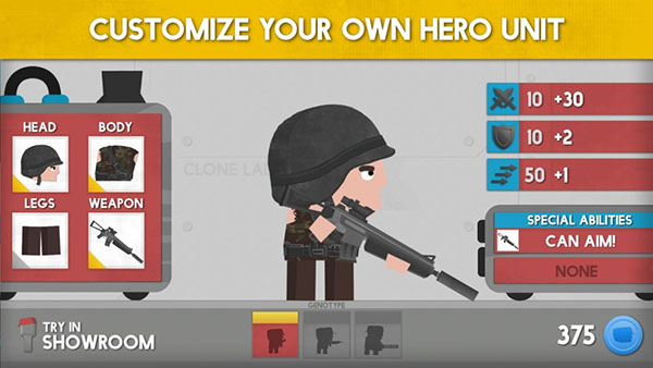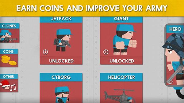 3、选择你自己的单位和不同的克隆,从迷你枪挥舞士兵喷气包或罐设计你的军队。快来和真棒游戏力学和直观的控制发挥最冒险的军事游戏。