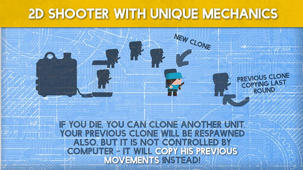 克隆军团是一款费脑的策略游戏,刚开始看这游戏的简介时不是很明白,但游戏中感觉很有趣,游戏的玩法就是操控小人攻击敌人,死后便回到起点并了增加新的小人,我们可以操控新产生的人,并将之前的小人自动重复之前自己所有控制,所以整个流程其实是自己一个人在操控着所有友军,敌人会比较难打,子弹可以向任意方向射击(除匕首喷火器火箭筒散弹枪飞机激光),而且攻击距离也比友军打得远,有些关卡克隆速度明显过快。大家可以通过走位躲过子弹,也可以用个炮灰吸引火力然后用范围伤害的人物攻击。这游戏敌人也是有些攻击死角的,比如喷火和机枪,因为枪口离身体较远可以用匕首贴身削死,直升机攻击要一定角度所以可以跳到等高躲避炮弹并攻击。喜欢的朋友可以试试这款