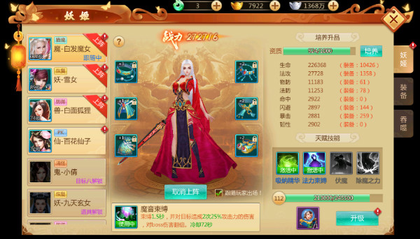 仙师可以同时装备三个妖姬,并且带一个妖姬上阵。可以使用妖姬进阶丹,升级妖姬,