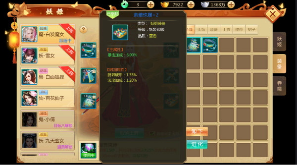 妖姬可以通过不断吞噬低于自身品质的装备获得进化,更进一步的提升战力。