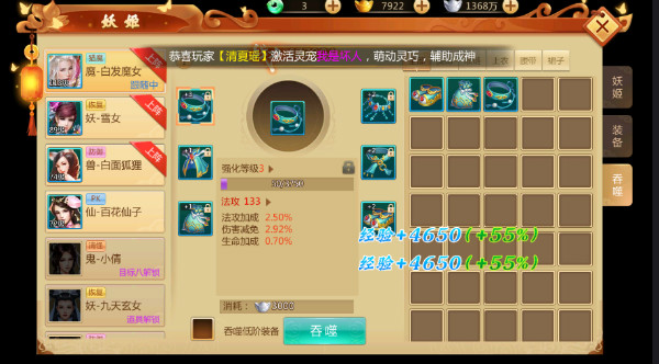 使用银两吞噬妖姬装备,可以提升妖姬装备的属性