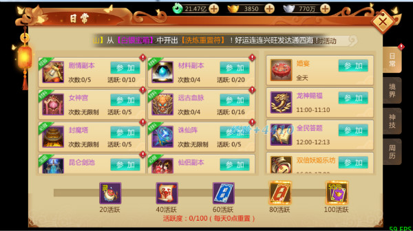 前期修炼还有小窍门,可以参加日常活动,免费获取经验灵酒和离线挂机卡。可以获得双倍修炼时间和离线修炼时间。