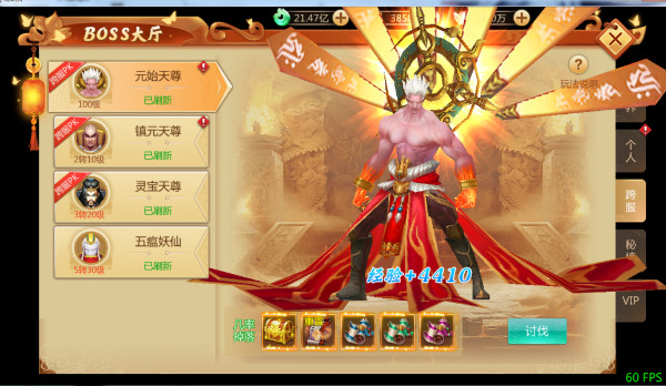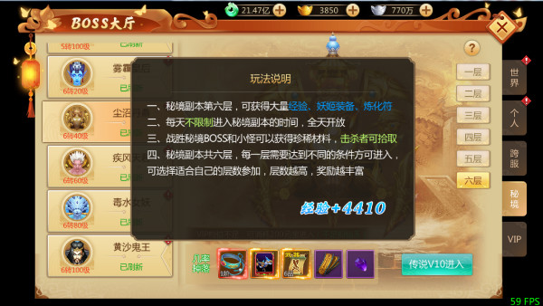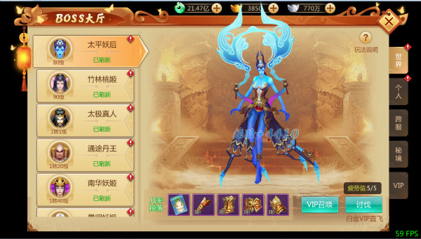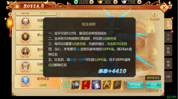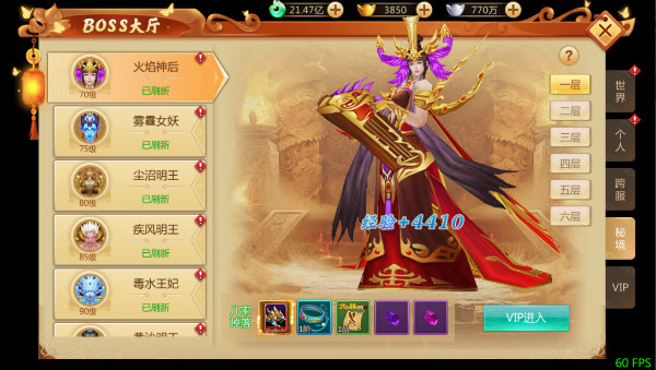 点击主界面boss图标,可以直接进入boss大厅,boss大厅分为世界boss、个人boss、跨服boss、秘境boss和vipboss。