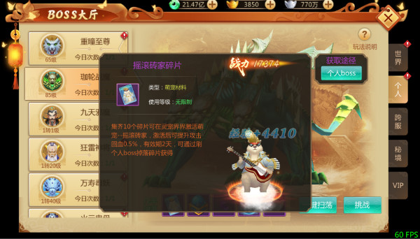 个人boss可以获得转生材料,还有机会掉落萌宠—摇滚砖家。