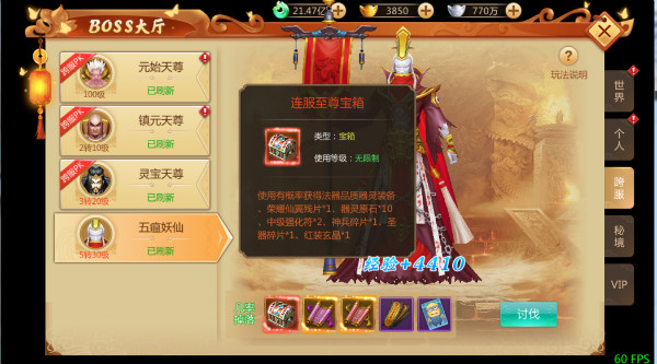 跨服boss可以获得连服至尊宝箱,有概率开出神兵碎片,圣器碎片,红装玄晶,打造出神兵圣器极品红装!
