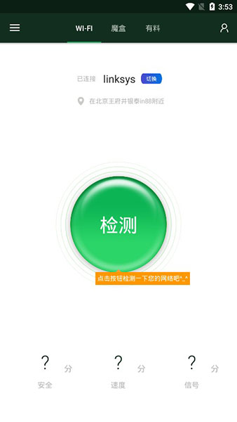 WIFI魔盒无需专业的技能,只需点点点,就可以检测wifi,从信号、网速、安全三个方面去检测wifi,操作方式如下: