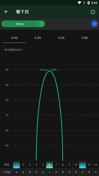 信号很强,可是还是上网体验不佳,很可能的原因是WiFi被干扰了,目前很多环境下2.4G频段下,干扰尤为严重。想了解环境里的干扰情况,请点击看干扰,这里的波形图越多代表环境干扰数量越多,波形图越高代表信号越强,其中绿色为当前连接,默认进来是2.4G频道,右滑可以切换到5G,其中2.4G常用的信道是1、6、11,最底部显示每个信道的干扰数