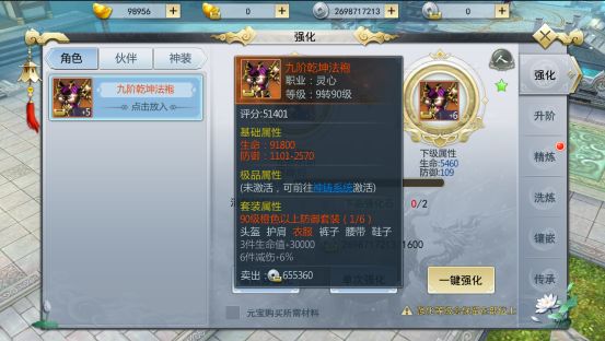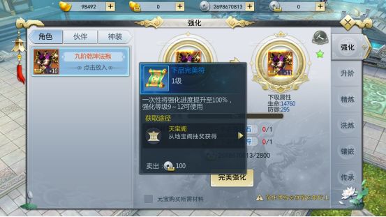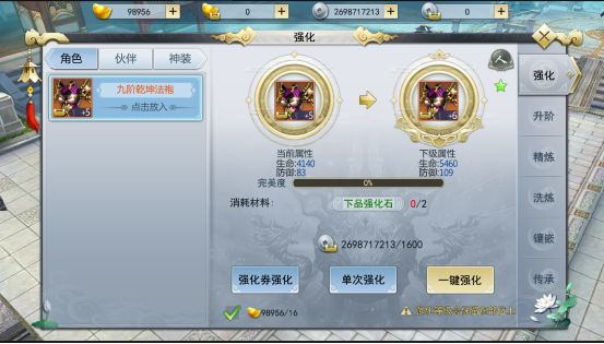 所有任意等级的装备都可通过消耗对应品阶的强化石与绑铜进行强化以提升装备部位的属性,逐渐填充强化完美度。点击“单次强化”可对该装备强化一次,如果背包内有足够的强化石就可以选择点击“一键强化”,一次性将装备强化至下一强化等级。