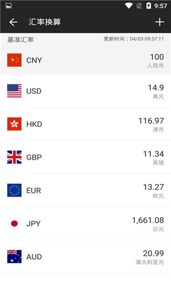 实时汇率、支持160多个国家、长按拖动排序、点击切换基准货币、侧滑删除货币