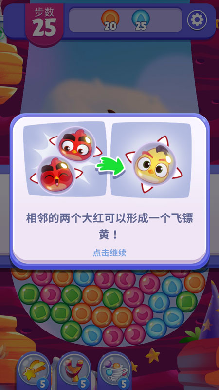 1、愤怒的小鸟梦想爆破最新版的玩法十分简单,根据游戏给出的需要消灭的相应颜色的泡泡进行点击,在规定的步数内将其全部消灭即可完成关卡。