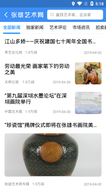 资讯软件,相信很多朋友都熟悉这款软件吧,随着我们社会的发展,艺术和历史是我们努力探索的,推动这我们祖国的发展,同时艺术又有着很大的魅力。这是给大家提供的一个艺术平台,有着很多的艺术家家,来自于各行各业,超过几十万的企业家,全部都入驻在这里,艺术品也很多,大家可以慢慢欣赏,你可以和大家一起讨论每一件艺术品。非常强大的一个视频直播艺术交易中心,名家收藏,覆盖了很多艺术的领域,和全国很多著名的频道联合起来,让大家能够在这里分享,喜欢上艺术,交流各种心得。目前已开通了包括艺术家网、全球艺搜、在线商城、在线培训、拍品征集、淘宝区、艺博论坛、指纹鉴定等十几个频道,内容日益精彩,资讯日渐丰富,栏目影响力正在不断攀升。