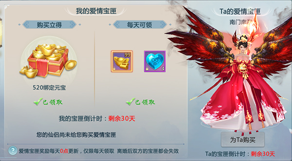 当上仙们达到213级后,仙缘系统开放,在与心仪之人正式结为仙侣后,即可为另一半购买爱情宝匣。爱情宝匣的收益全部由另一半获得,且每日宝匣收益仅能当天领取,不能累积;双方都可为对方购买,但离婚后双方的宝匣都将失效。真正的爱情如同流水般细水长流,在于对所爱之人的关心与付出。为心爱的伴侣购买爱情宝匣,购买当天对方立即收回本金,之后的30天内都可以持续获得每日宝匣收益。520元宝,3490绑定元宝返还,整整671%收益除了高达671%的高额元宝返利外,伴侣还将获得大量三生石奖励,强化同心锁获得更高战力加成。不要犹豫,快为心爱之人购买吧~