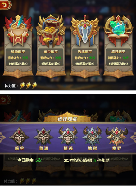 1.金币副本在角色到达一定等级后开放,分成简单、普通、精英、地狱、修罗五个难度,难度会随着角色等级提升而解锁;