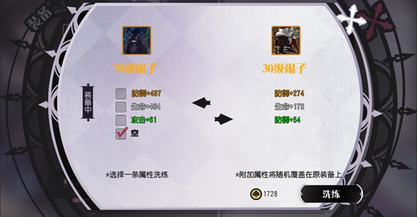 一件装备上最多同时拥有6条属性,达到6条属性之后再进行洗炼的话就需要选择其中一条属性和希望洗炼的属性替换,如果没有替换到希望的属性的话,可以花费钻石取消这次洗炼,但是用于洗炼的装备也会消失。