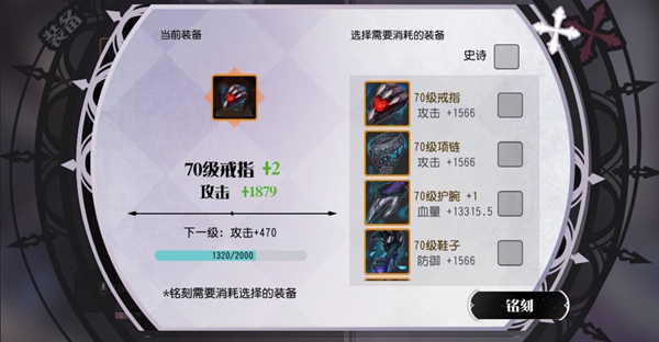 装备铭刻是后期开放的培养系统,属于装备吃装备升级从而提升基础属性的玩法。铭刻需要消耗同等级同品质的装备,每件装备提供一定的铭刻经验值,当铭刻等级提升后,玩家相应的装备基础属性也会随之提升。