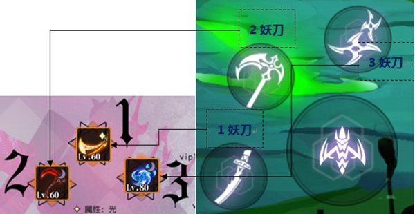 妖刀系统有3个主要上阵位,这3个位置直接影响玩家在战斗中使用技能的效果。而妖刀中有很多种不同效果,代表了不同技能,也就是玩家不同的妖刀搭配可以得到不同的战斗效果,自然有不一样的战斗体验。