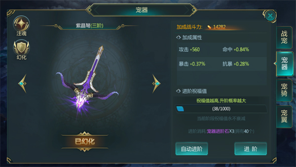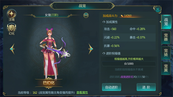 系统简述:战宠所使用的武器,可通过收集对应的升级道具或者直接花费绑钻和钻石来对进行升级。升级后,增加游戏角色对应的属性,并且获得新的战宠形象,可以直接在场景中展示出来。玩家可以随时选择展示自己已经获得的战宠形象。同时战宠可以进行注魂的培养,直接使用道具来增加战宠当前的属性。