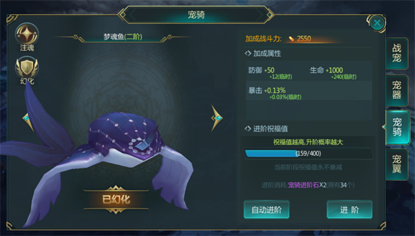 系统简述:战宠所使用的坐骑,可通过收集对应的升级道具或者直接花费绑钻和钻石来升级。升级后,增加游戏角色对应的属性,并且获得新的战宠坐骑形象,可以直接在场景中展示出来。玩家可以随时选择展示自己已经获得的战宠坐骑形象。同时战宠坐骑可以进行注魂的培养,直接使用道具来增加战宠坐骑当前的属性。