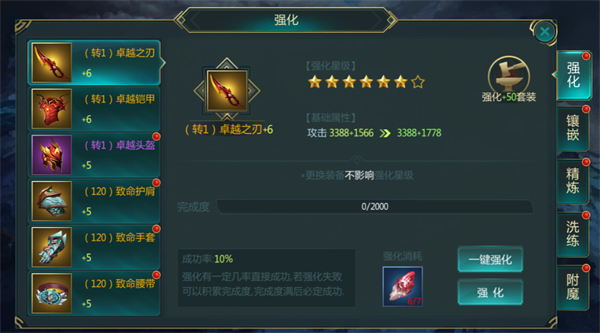 使用“强化石”给对应装备强化,获得属性。装备的等级越高、品质越高,强化属性就越强。强化后,会给每件装备赋予星级,当星级越多时,强化的概率就越低。当强化失败时,则会增加完成度。重要的是强化可以永久继承!