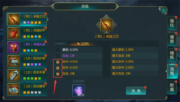 使用“洗练石”给对应装备洗练,获得属性。洗练的属性条目数量是根据装备的品质来的,洗练的数值上限是根据装备的等级来的。越高级、品质越好的装备,洗练的属性越好,小技巧提示,洗练出来的属性可以通过小锁可以锁定,则洗练时候就不会更改被锁的属性。