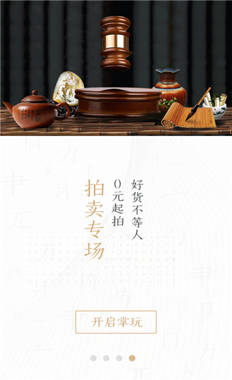 掌玩安卓版是一款艺术品手机交易平台,该软件内有海量的古文文玩,各种艺术品分类应有尽有,汇集了书法、国画、油画、非遗、陶瓷、紫砂、文玩杂项等等。还有海量的热门拍品,低价0元开始喜欢收藏的用户千万别错过哦~另外还可以在寻宝栏中寻找自己喜欢的古物文玩,各种商品明码标价喜欢哪款直接收一下付款收走,另外你要是有想要出售的文艺品也能够上传到这款软件上来哦~并且写上对它的详细信息。除了能够在这里出售和购买商品之外,还能在发现栏看到关于一些文化艺术的资讯。另外用户还可以在这里进行特别定制,各种艺术品的大师在这里跟你一对一的进行交谈,把你的要求全部告诉他过不多久你就能够收到你想要的艺术品,在掌玩里用户可以看到关于个位大师的详细介绍等等。若是你喜欢这款软件的话就赶紧来下载吧!