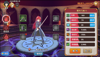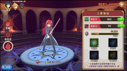 【升级】界面可通过消耗升级材料提升角色等级,角色登记的提升将会影响到角色及团队实力。左上角可查看实力排行榜。