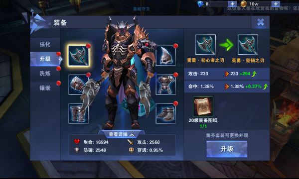 1、装备升级需要消耗升级图纸(图纸在失落神庙和领地商店获得);