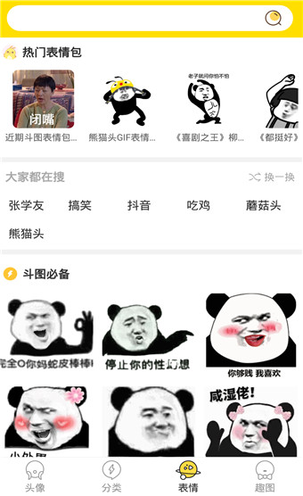 微信头像、动漫头像等等,你想要哪个就用哪个,操作也很简单哦~直接选中你想要更换的那个头像后点击右下角的下载按键就能够直接下载到手机相册中去,然后你就可以去设置你的头像了是不是很简。除了能够更换头像之外呢,在这里还有超级多的表情包可以使用哦,你还是在为聊天时表情包不够而烦恼吗?那就赶紧来下载这款软件吧,各种沙雕表情包任你选,你可以选择下载到手机中去或者是直接分享给正在跟你聊天的好友那去,非常的有趣。除了这些以外,趣玩头像还有一个趣图板块在这里用户可以看到非常多有趣搞笑的GIF动态图,有的动图真的很搞笑,能够让你捧腹大笑的那种哦~要是有需要的话就赶紧来下载吧!