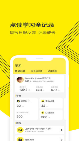 7、学情—多维学情更贴心:智能学情日历表,标记当前学情状况。您可根据日期选择查看当前全部学习数据,支持查询口语评测多维度详细数据查看,并可回放之前评测录音。