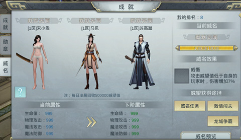 2、获得威名可以获得“威慑”BUFF,对威名等级低于自身的玩家增加7%伤害;